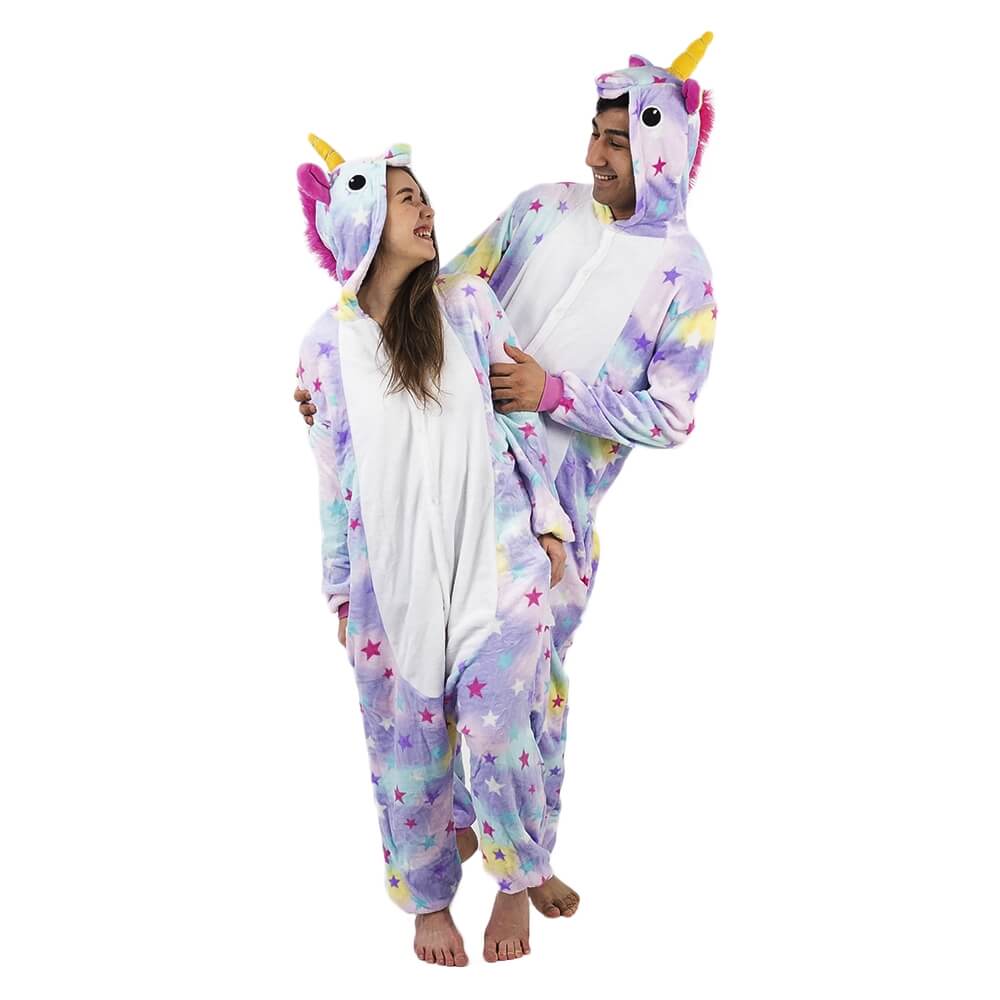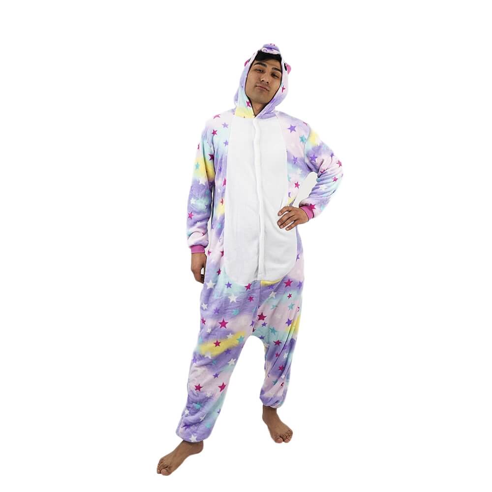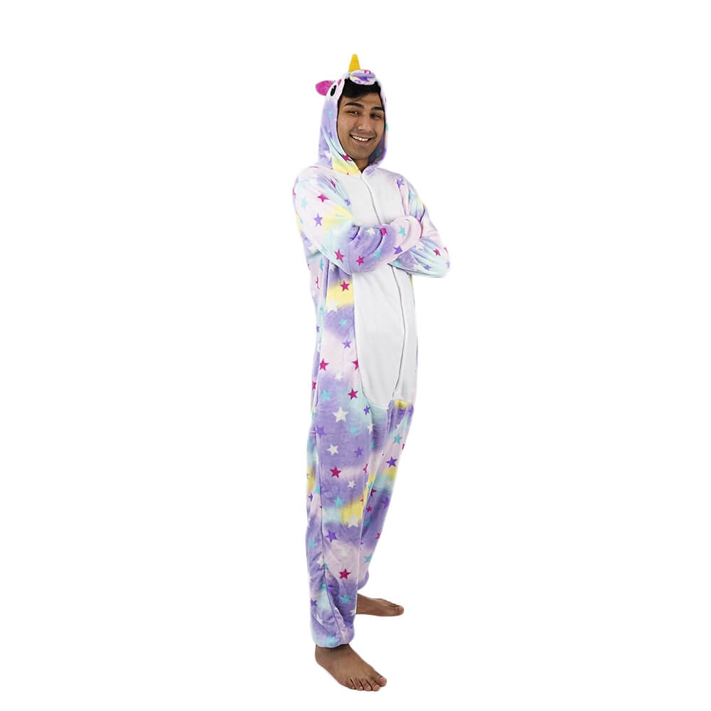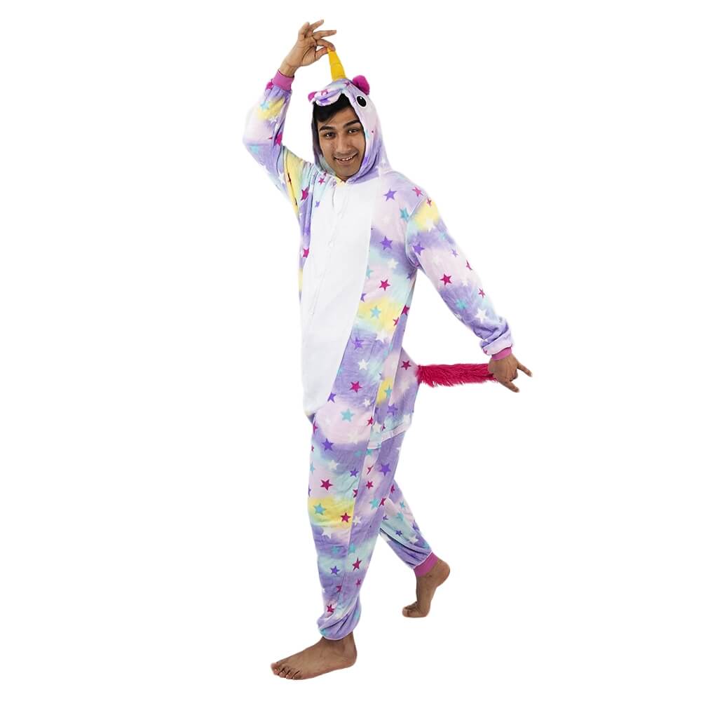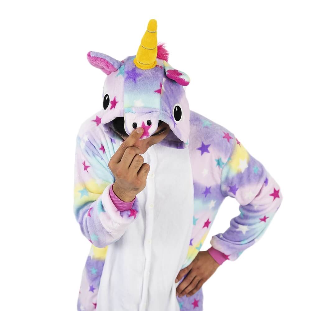 Красочный кигуруми Единорог создаст праздничное настроение. У него фантастический дизайн: большой мягкий рог на капюшоне, розовая грива и объемные ушки, сзади – хвост под цвет гривы. Основная ткань – разноцветная, усыпанная звездами, а на животике – белая вставка.