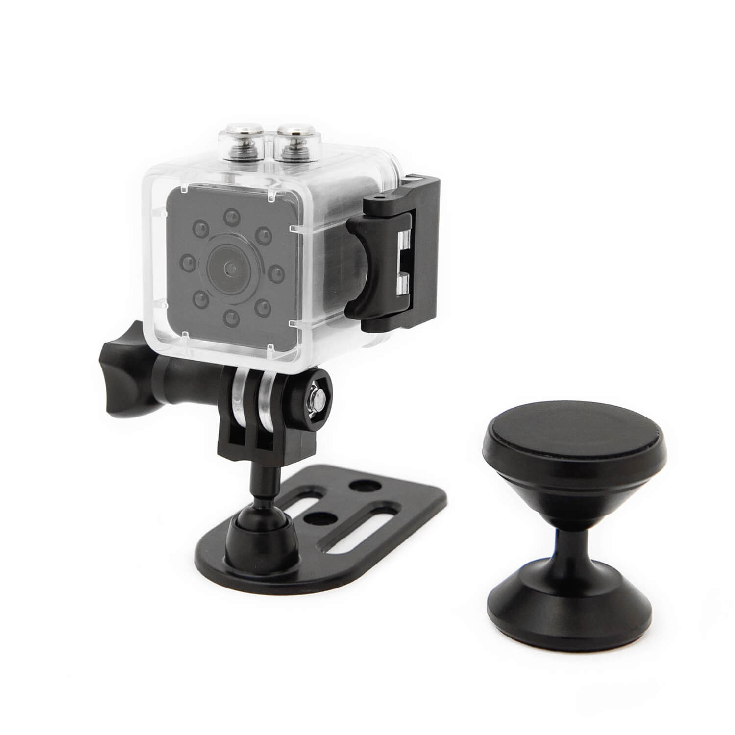 Мини видеокамера в форме кубика на подставке с шаровой опорой. Камера легко крепится к любому основанию и настраивается в нужном направлении. Восемь ИК светодиодов обеспечивают ночную съемку на расстоянии до 5 метров. Возможно использовать карту памяти Micro SD до 32 Гб с циклической записью. Встроенная литий-ионная батарея обеспечивает до 90 минут автономной работы в режиме записи.